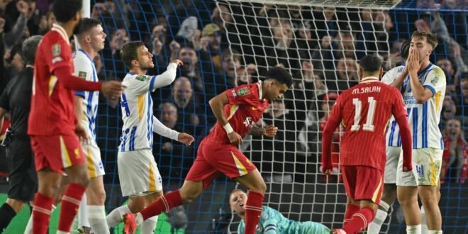 منبر العراق الحر :بلغ ليفربول حامل اللقب الدور ربع النهائي من مسابقة كأس الرابطة الإنكليزية لكرة القدم بفوزه على برايتون 3-2 الأربعاء.