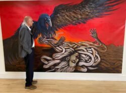 لوحة ” البحث عن الضمير” هي عمل سريالي غني بالرموز والتفسيرات. عبر أستخدام رمزية الغراب والرأس المشوه، يعبر الفنان د. علاء بشير عن صراع الإنسان مع ضميره، وسط عالم مليء بالفوضى والتشوهات اللوحة تطرح تساؤلات فلسفية عميقة : كيف يمكن للإنسان أن يستعيد ضميره المفقود ؟ وهل يمكن للتجربة الفردية و الجماعية أن تعيد تشكيل الضمير الإنساني من جديد.؟
