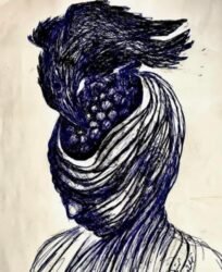 الخطوط العشوائية والمتحركة توحي بحالة من الديناميكية والتوتر، وكأن الشخصية تعيش صراعاً داخلياً أو عملية تحول مستمرة الإنسيابية في الخطوط تجعل المشاهد يشعر وكأن اللوحة تعكس حالة ذهنية غير مستقرة. (الخطوط غير المنتظمة) في اللوحة تعكس صراعات داخلية لا تنتهي، كأنها تشير إلى الأفكار المتضاربة التي تدور في ذهن الإنسان. والخطوط التي تلتف حول العنق والرأس توحي بالقيود التي تفرضها النفس على نفسها أو التي تفرضها الضغوط الإجتماعية والسياسية و الثقافية و الأقتصادية… الخ) وهذه الخطوط تعبر عن حالة اختناق فكري أو عاطفي.