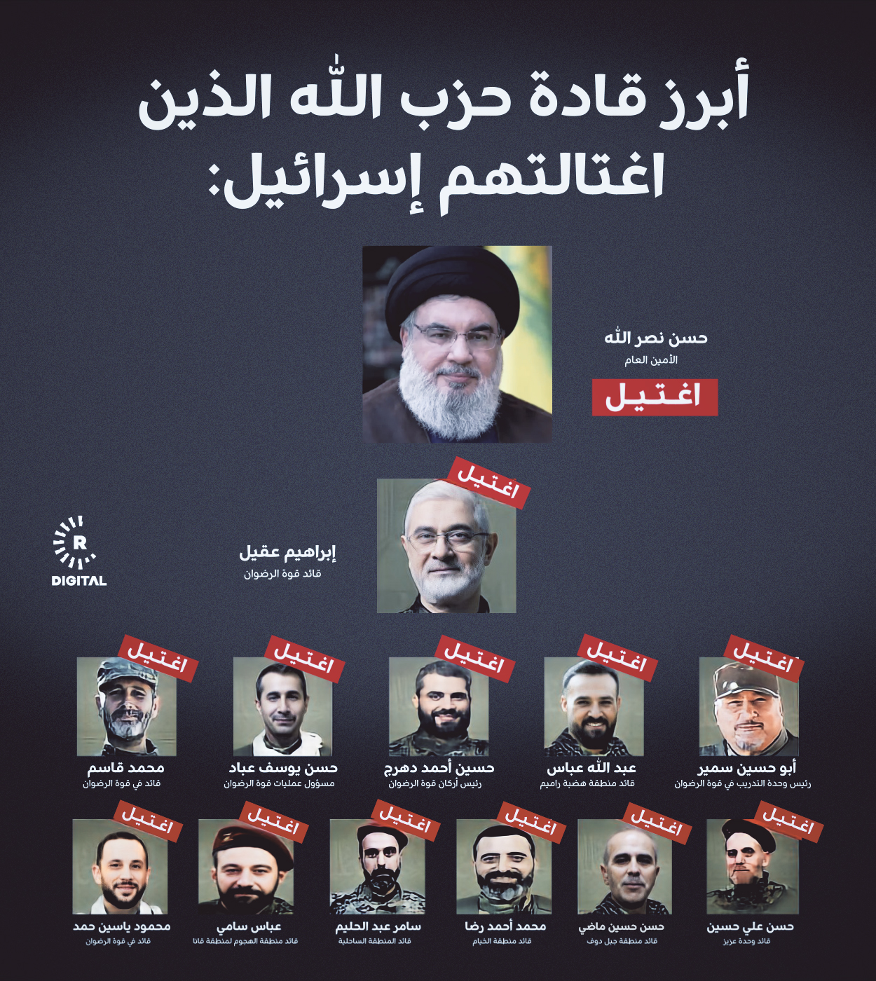 لكن قبل قتله، تقرر إضعافه أولاً. لذلك، قُتل إبراهيم عقيل، قائد قوات العمليات الخاصة (رضوان) في الحزب مع عدد من القادة الكبار الآخرين في (20 أيلول 2024). كان عقيل الذراع اليمنى لنصر الله.