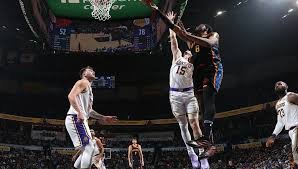في أوكلاهوما سيتي، قاد الثلاثي السلوفيني لوكا دونتشيتش وأوستن ريفز وليبرون جيمس ليكرز إلى فوزه الرابع في آخر خمس مباريات والـ48 هذا الموسم، بعدما سجل الأول 30 نقطة مع 7 متابعات و6 تمريرات حاسمة والثاني 20 نقطة والثالث 19 مع 7 تمريرات حاسمة، في فوز كبير على ثاندر متصدر الغرب الذي ضمن منذ فترة تأهله إلى الـ”بلاي أوف” وصدارته للمنطقة ومجموعة الشمال الغربي.
