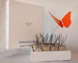 أعمال تجسّد الدمار البيئي، مثل دائرة حمراء مصنوعة من شرانق الفراشات الميتة، ترمز إلى فقدان التنوع البيولوجي.