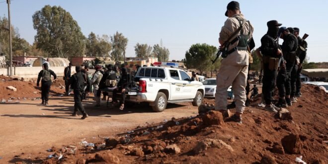 Syrian government security forces stand atop an earth barrier that they created as a buffer during their deployment in Busra al-Harir in Syria's southern Daraa province on July 21, 2025. Calm returned to southern Syria's Sweida province on July 20, a monitor and AFP correspondents reported, after a week of sectarian violence between Druze fighters and rival groups that killed more than 1,100 people. (Photo by OMAR HAJ KADOUR / AFP)