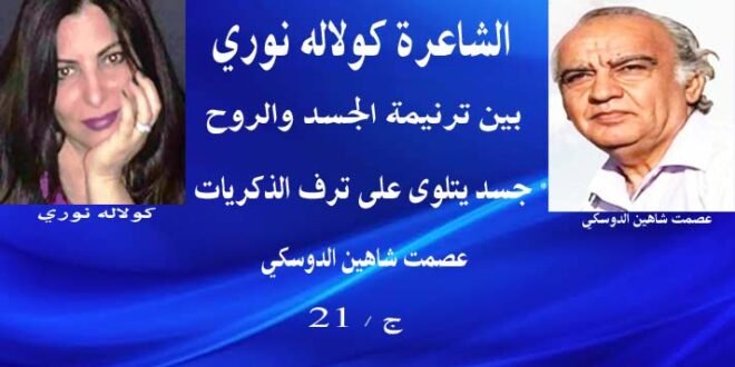 في صحوة أخرى ترتفع ( ترنیمة الجسد ) التي أرادت لھا كولالة نوري أن تكون علیه ما تكون .. ھي صحوة أدبیة فكریة تتسلل إلى الروح لتھیج الجسد في ترنیمات یشع تأثیرھا ، ھكذا تغدو الترنیمات الروحیة ولیست الجسدیة رغم التلامس أو التجانس الاثنین معاً ( الروحیة والجسدیة ) ، من هذه الأطر یكون تأثیر الأول على الثاني اكبر وأعمق ، من صلتھ مع الآخرین ، والأشیاء حتى إ كانت رمز الالتقاء الوصال ، الریاح ، تجسید حركي یراد بھ غایة جسدیة كأن الجسد منفصل عن الروح ، أو ترسو صورة فكریة مجسدة بكلمات بھذا المعنى ، من منطلق الحركة إیجاز لا یجوز ولا یستسیغ لھ الفكر كصورة شعریة ، جمالیة ، وإقناع المتلقي بضبابیة المفردة تضاد الواقع .ولا واقع ، حالة من الجهد والعناء للشاعر قد لا تصل للقیمة الروحیة التي تصب في أصالة الإنسان ،حیث التقیا ) كانت الریاح تعرف ، بأنھا ستنجب ( ربما طفلا معاقاً أو معجزة التمرد على أیة حالة یخلق صورة مختلفة لا تقابلھا بالشكل والمضمون ، وإن ظلت الحالة كما ھي بعد التمرد والتیار المضاد یتوارى المسمى الفكري إلى سراب الشعر والأدب بصورة عامة ، حالات القلق والشك والغضب والمضادات الفكریة التي توجھ بشكل سلیم إلى مائدة الإنسان وتقدم لھ بطبق من الذھب ، ینشأ عن التیھ والدوران في دجنة خالیة ، فالطلاسم المجدیة، لھا طقوسھا النفسیة والروحیة الفكریة ، ولیس الطلاسم مجردة وجدت لتفك رموزھا لتنقل الروح تراتیل . سوداویة یا تاج الجسد یا نار الحطاب ) أیھا الطفل الوحش الفجر والقیلولة (يتهيجان تحت إبطك الاعتراف بالوهن والإحباط النفسي وتأویل الوھن والعشق والرؤى والأیام التي غادرت ، لیست خسارة بقدر ما ھي ترنیمھ روحیة تشع بالأمل ، رغم الحزن والأسى ، رغم الهزيمة النفسیة التي جعلت أو صورت العشق تراجعا في یوم خاسر . وتركت ترنیمة روحیة على لحن الخسارة عشقتني في یوم خاسر ) سمعتني في الیوم الثالث والنصف وفي یوم الثامن رأیتني ( ساعتها كانت الأیام قد غادرت ، كولالة نوري غیرت مجرى الجداول المتشعبة غدت في جسد یتلوى على ترف الذكریات والآلام ، وترنم روحھ ترانیم الأشجان المحترقة ، لتغدو تلك القبلات حماقات، وجحیم خداع ” هذه القبلات سلمنا إلى جحیم المیاه ” انطلاق الطیور شعاع سماوي ، أمل روحي ونفسي قبل أن یرتطم بجدار المادیات المیتة ، “حین تنطلق طیورك تصعد السماوات نحوي ” . وھي إحیاء والتقاء الترنیمات الروحیة التي یكون صداھا یملئ محراب الإنسانیة .