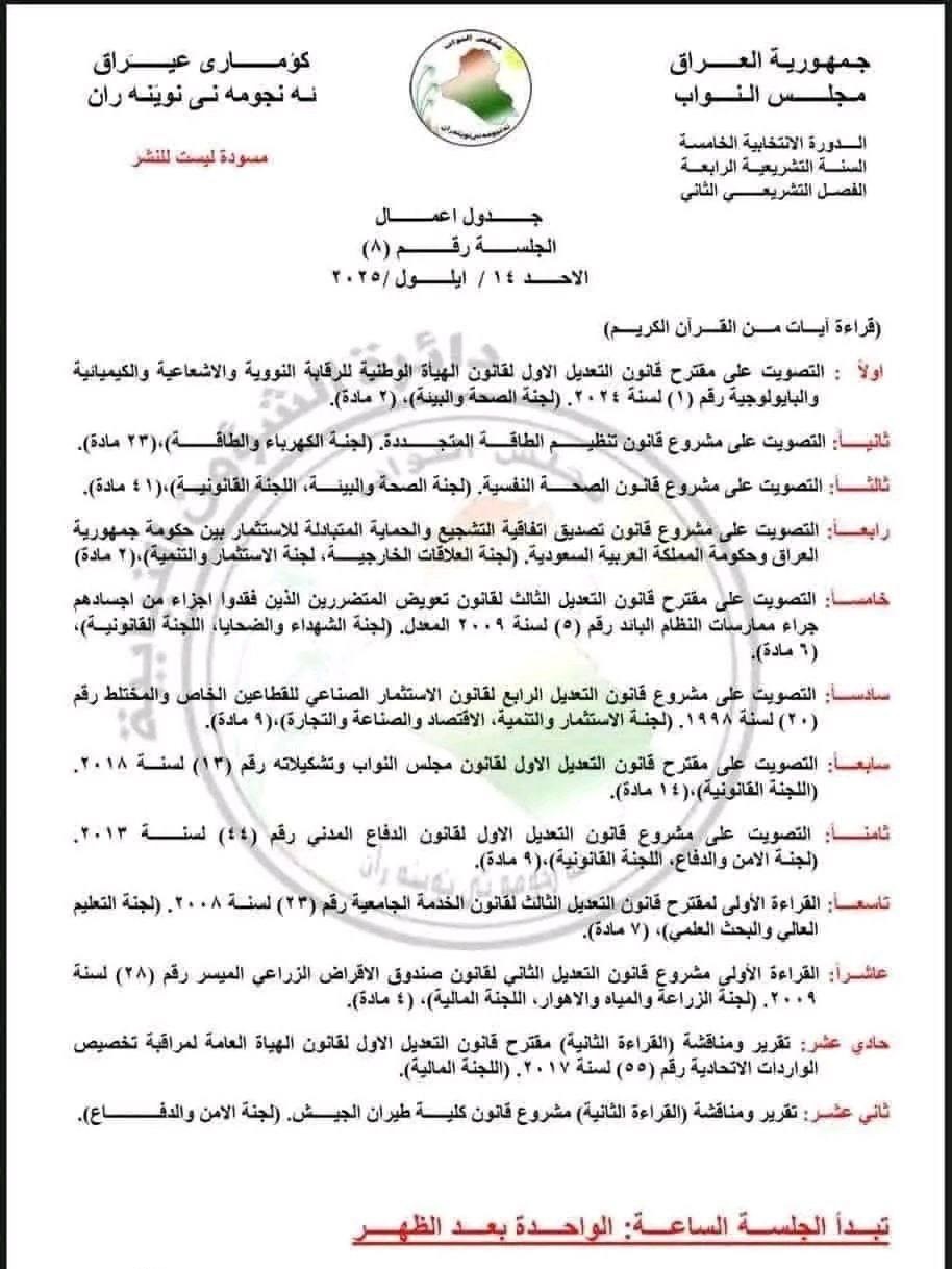 يعقد مجلس النواب العراقي يوم غد الأحد الموافق 14 أيلول 2025، جلسة يصوت خلالها ( وفق جدول أعماله ) على عدد من مشاريع القوانين وقراءة عدد آخر.