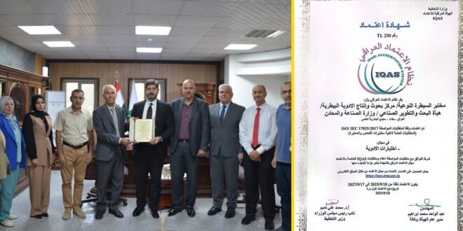 هيأة البحث والتطوير الصناعي إحدى تشكيلات وزارة الصناعة والمعادن تعلن عن تحقيق مركز بحوث وإنتاج الأدوية البيطرية التابع لها إنجازاً متميزاً يُعد الأول من نوعه في العراق، بحصوله على شهادة الاعتماد رقم TL 250 الخاصة بمختبر السيطرة النوعية في مجال اختبارات الأدوية وفقاً لمتطلبات المواصفة الدولية ISO IEC17025:2017، والمتوافقة مع معايير الهيأة العراقية للاعتماد (IQAS) التابعة لوزارة التخطيط.