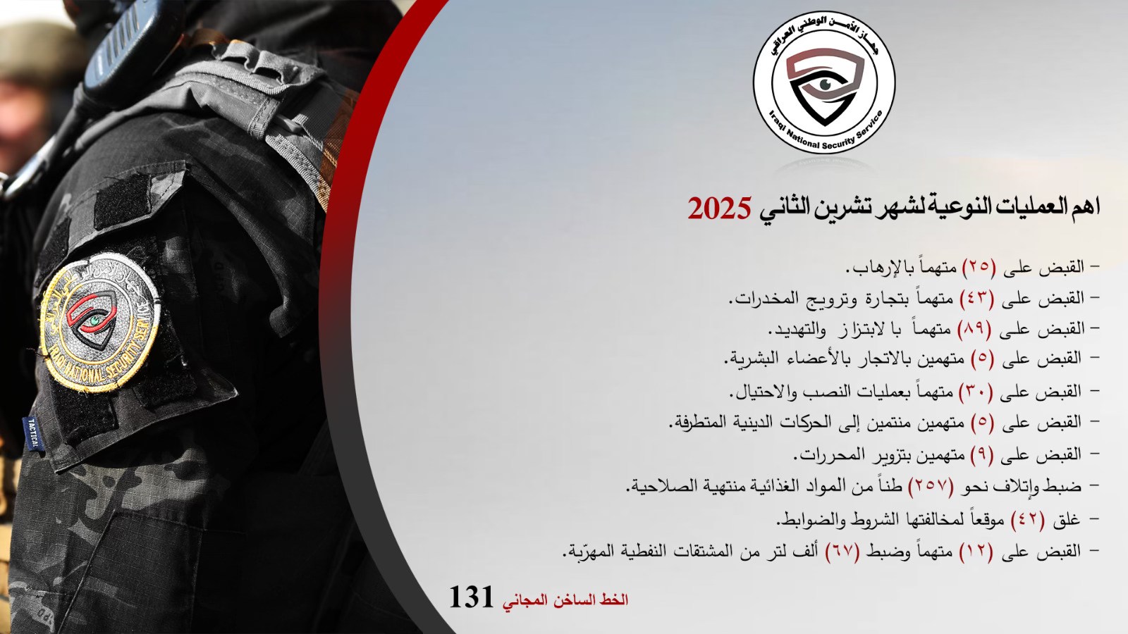 أعلن جهاز الأمن الوطني ، اليوم الاحد، حصيلة أهم العمليات النوعية خلال شهر تشرين الثاني ٢٠٢٥،