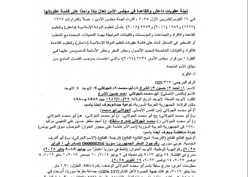 كما نشرت “الوقائع العراقية” تعديلاً يتعلق بصفة الرئيس السوري المؤقت، حيث تم تغيير تصنيف أبو محمد الجولاني، رئيس هيئة تحرير الشام، إلى أحمد الشرع، وذلك استناداً إلى قرار صادر عن لجنة عقوبات داعش والقاعدة في مجلس الأمن الدولي.