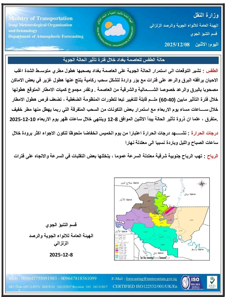 واضاف التقرير “وتقدر مجموع كميات الامطار المتوقع هطولها خلال فترة التأثير مابين (40-60) ملم قابلة للتغيير تبعا لتطورات المنظومة الضغطية ، تضعف فرص هطول الامطار خلال ساعات مساء يوم الاربعاء مع استمرار بعض التكونات من السحب المتفرقة التي ربما يهطل منها مطر خفيف متفرق ، علما ان ذروة تأثير الحالة يبدأ الاثنين الموافق 8-12 وينتهي خلال ساعات ظهر يوم الاربعاء “.