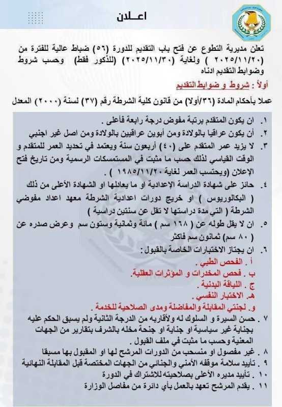 وأشارت المديرية إلى أن التقديم يخص منتسبي الوزارة من رتبة مفوّض درجة رابعة فما فوق، ممن يحملون شهادة الدراسة الإعدادية أو ما يعادلها، على أن يخضع المتقدّم لاختبارات الفحص الطبي، وفحص المخدّرات والمؤثّرات العقلية، واللياقة البدنية، والاختبار النفسي قبل حسم قبوله النهائي.
