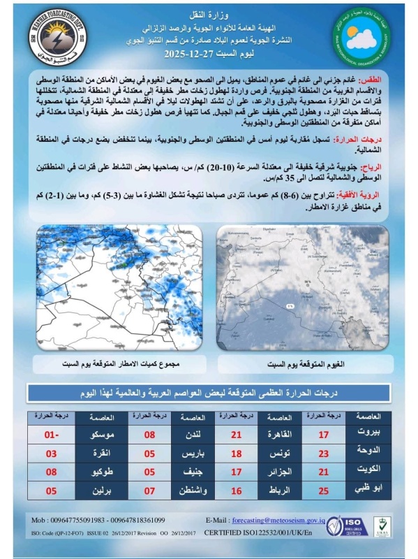 توقعت الهيئة العامة للأنواء الجوية، اليوم السبت ( 27 كانون الأول 2025 )، طقساً غائماً جزئياً إلى غائم في عموم البلاد، مع فرص أمطار خفيفة إلى معتدلة شمالاً قد تشتد ليلاً وتكون مصحوبة بالبرق والرعد وتساقط البرد، واحتمال ثلوج خفيفة على الجبال، وتبقى درجات الحرارة مقاربة ليوم أمس في الوسط والجنوب، وتنخفض قليلاً في الشمال.