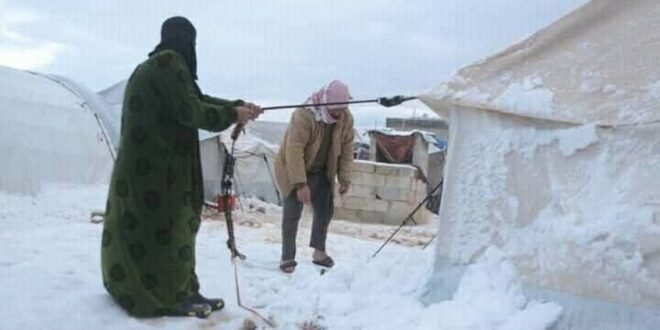 منبر العراق الحر : تسببت العاصفة الثلجية التي ضربت سوريا قبل أيام في تفاقم الأوضاع الإنسانية بمخيمات النازحين بمحافظتي إدلب وحلب شمال غرب سوريا، حيث أدت لاقتلاع خيام مخيم التوحيد على طريق شمارين.