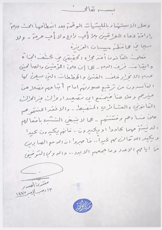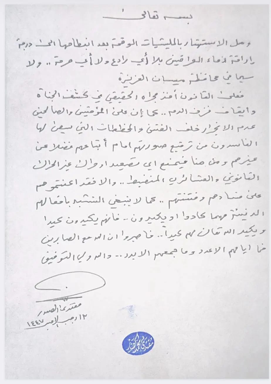 منبر العراق الحر : وجه زعيم التيار الوطني الشيعي مقتدى الصدر، اليوم السبت ( 3 كانون الثاني 2026 )، رسالة بخط يده موجّهة إلى أهالي محافظة ميسان، فتح فيها ملف الميليشيات المنفلتة وسفك الدماء في المحافظة، محذراً من جرّ المجتمع إلى دوامة العنف العشائري، ومتوعداً بكشف المتورطين بقتل الأبرياء وعدم السماح بتحويل دماء أبناء ميسان إلى ورقة تصفية حسابات بين الجماعات المسلحة.