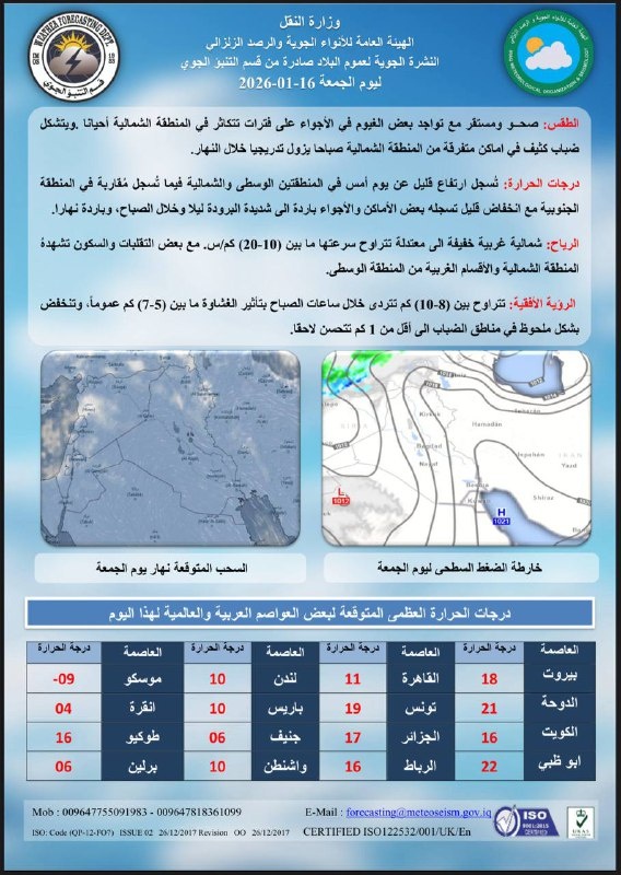 توقعت هيئة الأنواء الجوية، اليوم الجمعة ( 16 كانون الثاني 2026 )، طقساً صحواً ومستقراً مع بعض الغيوم، وتكوّن ضباب صباحي في مناطق شمالية يزول لاحقاً، فيما تسجل درجات الحرارة ارتفاعاً طفيفاً وسطاً وشمالاً وتكون مقاربة جنوباً، مع أجواء باردة.