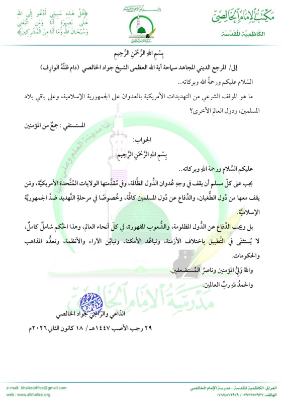 وشدد الخالصي في ردّ على استفساء قدّمه جمع من المؤمنين، تساءلوا فيه عن الموقف الشرعي تجاه التصعيد الأمريكي في المنطقة، لا سيما ضد إيران، “على وجوب الوقوف في وجه التهديدات الأمريكية بالعدوان على إيران، وعلى دول وشعوب العالم المستضعفة”، مبينا أن “الموقف الشرعي يفرض مواجهة الطغيان بكل أشكاله”.