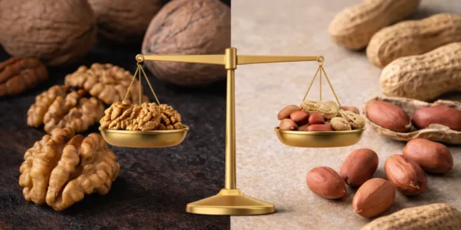 ولكل منهما مزاياه الغذائية الخاصة؛ إذ يتميّز الجوز بمحتوى أعلى من الدهون الصحية المفيدة للقلب، بينما يوفّر الفول السوداني كمية أكبر نسبيا من البروتين وبعض العناصر الغذائية.
