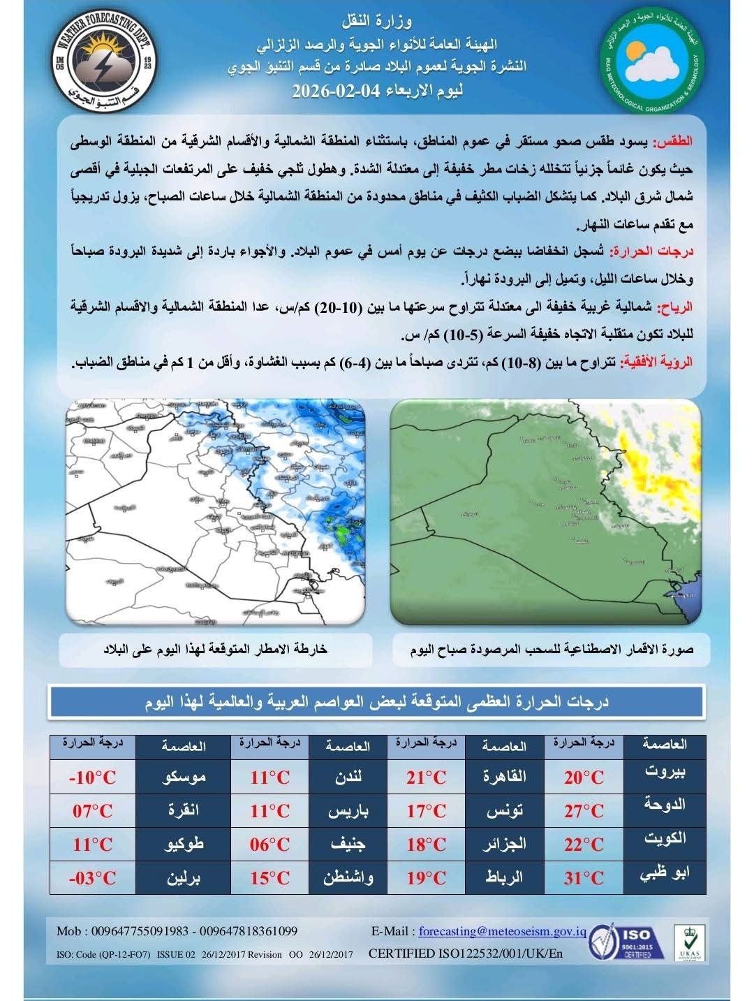 توقعت هيئة الأنواء الجوية، اليوم الأربعاء ( 4 شباط 2026 )، طقسًا صحوًا ومستقرًا في أغلب المناطق، مع غيوم وأمطار خفيفة شمالًا وشرق الوسط، وتساقط ثلجي خفيف على المرتفعات شمال شرق البلاد، وانخفاض درجات الحرارة لتكون الأجواء باردة صباحًا وليلاً.