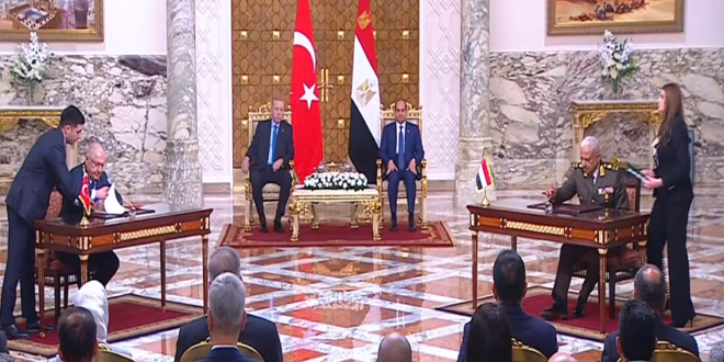 منبر العراق الحر :وقعت مصر وتركيا اتفاقية تعاون عسكري، اليوم الأربعاء في القاهرة، بحضور الرئيسين المصري عبد الفتاح السيسي والتركي رجب طيب أردوغان.