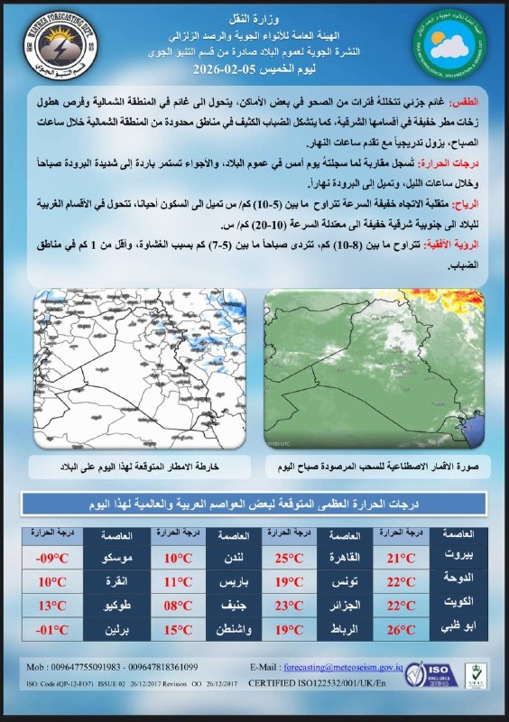 توقّعت هيئة الأنواء الجوية، اليوم الخميس ( 5 شباط 2026 )، استمرار تأثّر العراق بموجة برد قوية، مع طقس غائم وفرص لتساقط زخّات مطر خفيفة إلى متوسطة في بعض مناطق الشمال والفرات الأوسط، إلى جانب تراجع ملحوظ في درجات الحرارة واقترابها من الصفر في مدن عدّة، وتحذيرات من تشكّل الضباب والصقيع خلال ساعات الصباح الباكر.