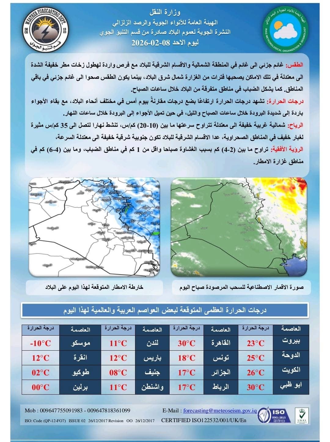 توقعت هيئة الأنواء الجوية، اليوم الأحد ( 8 شباط 2026 )، طقسًا غائمًا جزئيًا إلى غائم شمالًا وشرقًا مع زخات مطر خفيفة إلى معتدلة قد تشتد شمال شرق البلاد، وصحوًا إلى غائم جزئي في بقية المناطق، مع تشكل الضباب صباحًا وارتفاع طفيف في درجات الحرارة، وبقاء الأجواء باردة خاصة ليلًا وصباحًا.