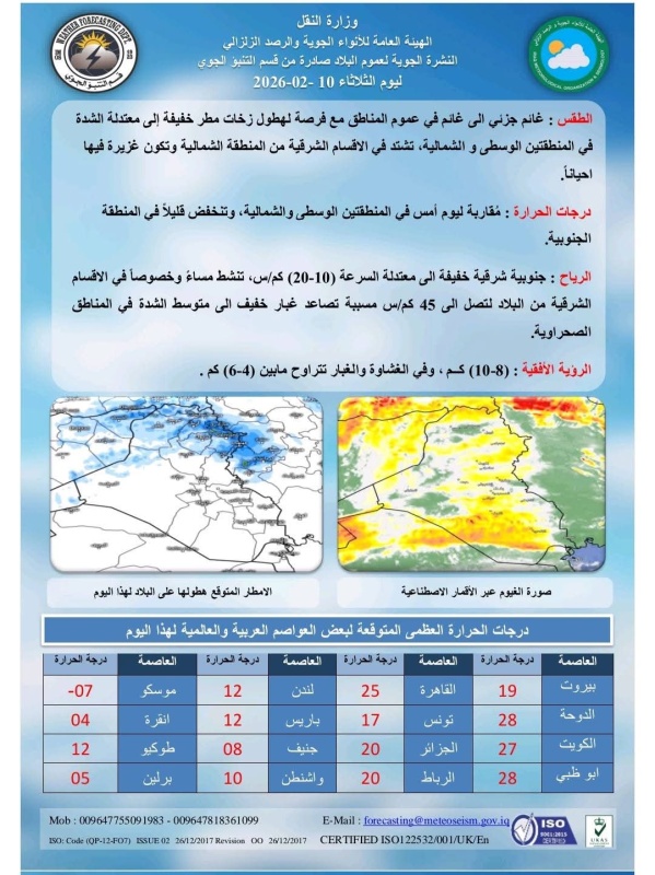 توقعت هيئة الانواء الجوية، اليوم الثلاثاء ( 10 شباط 2026 )، طقساً غائماً جزئياً إلى غائم في عموم البلاد، مع زخات مطر في الوسط والشمال قد تكون غزيرة شرق الشمال، ودرجات حرارة مقاربة ليوم أمس مع انخفاض طفيف جنوباً.