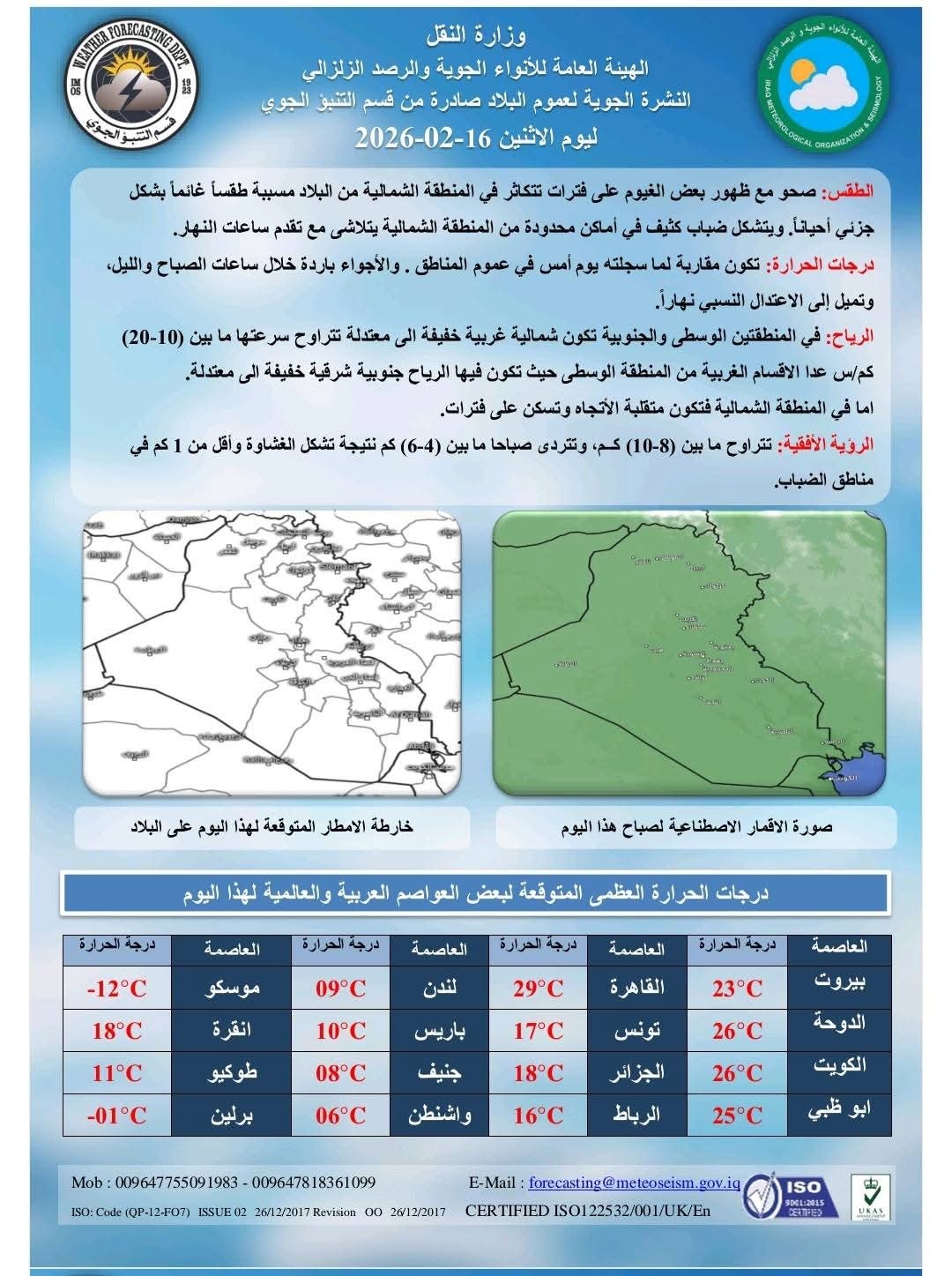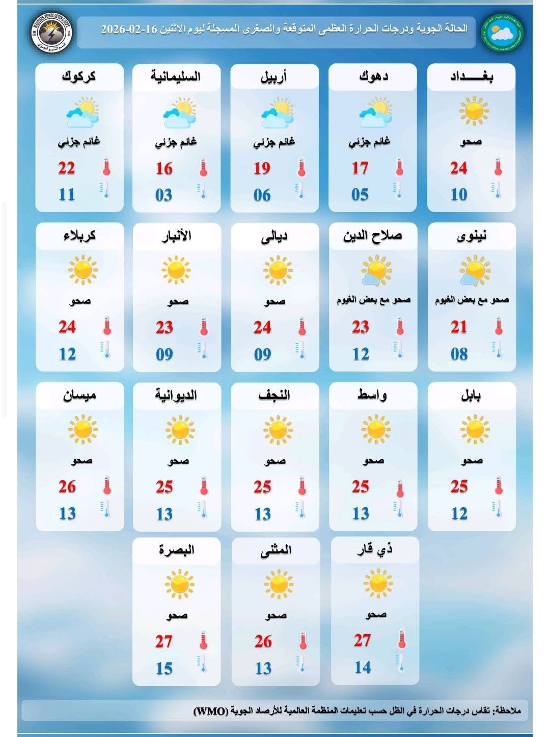 توقعت هيئة الأنواء الجوية، اليوم الاثنين ( 16 شباط 2026 )، طقساً صحواً مع غيوم متفرقة تزداد في الشمال، مع تشكل ضباب كثيف صباحاً يزول تدريجياً، موضحة أن درجات الحرارة مقاربة ليوم أمس، والأجواء باردة صباحاً وليلاً ومعتدلة نسبياً نهاراً.