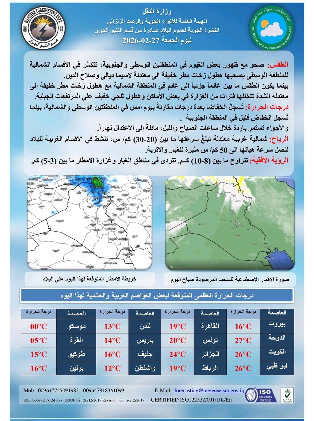 توقعت هيئة الأنواء الجوية، اليوم الجمعة ( 27 شباط 2026 )، أن يكون الطقس صحواً إلى غائم جزئياً في المنطقتين الوسطى والجنوبية، مع فرصة لهطول زخات مطر خفيفة إلى معتدلة في الشمال والوسط ولاسيما ديالى وصلاح الدين، حيث يسود الطقس الغائم مع أمطار متفاوتة الشدة وتساقط ثلوج خفيفة على المرتفعات، بينما تنخفض درجات الحرارة عدة درجات في الوسط والشمال، وبشكل طفيف في الجنوب، مع بقاء الأجواء باردة ليلاً ومائلة للاعتدال نهاراً.