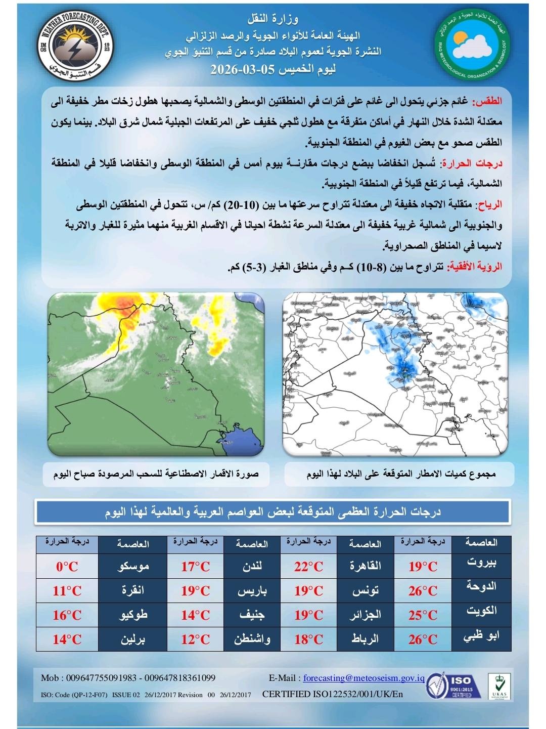 توقعت هيئة الأنواء الجوية، اليوم الخميس ( 5 آذار 2026 )، أن يكون الطقس غائما يصاحبه هطول زخات مطرية خفيفة الى معتدلة خلال النهار في المنطقتين الوسطى والشمالية، بينما يكون صحوا في المناطق الجنوبية من البلاد، اما درجات الحرارة فتسجل انخفاضا ببضع درجات عن يوم امس وترتفع في المناطق الجنوبية.