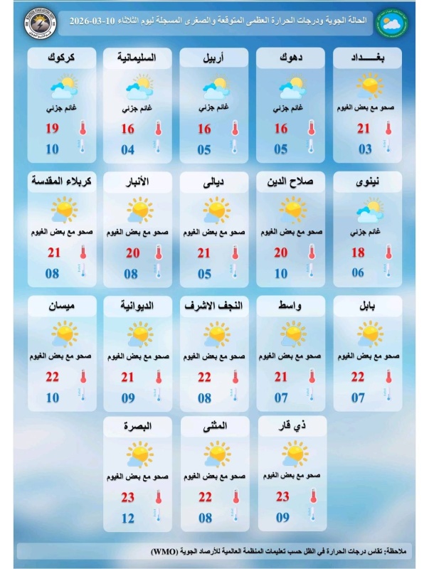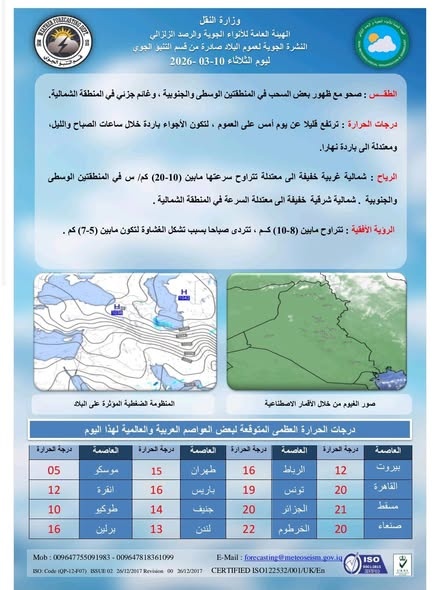 توقعت هيئة الأنواء الجوية، اليوم الثلاثاء ( 10 آذار 2026 )، أن يكون الطقس صحو مع ظهور بعض السحب في المنطقتين الوسطى والجنوبية، وغائم جزئي في المنطقة الشمالية، بينما ترتفع درجات الحرارة قليلا عن يوم أمس على العموم، لتكون الأجواء باردة خلال ساعات الصباح والليل ومعتدلة الى باردة نهارا.