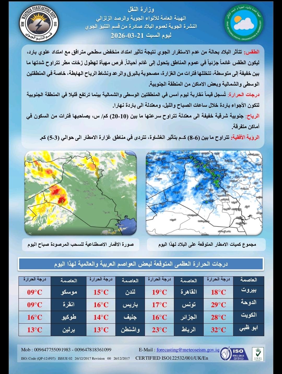 توقعت هيئة الأنواء الجوية، اليوم السبت ( 21 آذار 2026 )، أن يتأثر الطقس بحالة من عدم الاستقرار الجوي نتيجة تأثير امتداد منخفض سطحي مترافق مع امتداد علوي بارد ليكون غائماً مع فرص مهيأة لهطول زخات مطر خاصة في المنطقتين الوسطى والشمالية وبعض الاماكن من المنطقة الجنوبية، فيما تستقر درجات الحرارة في المنطقتين الشمالية والوسطى وترتفع قليلا في الجنوبية.
