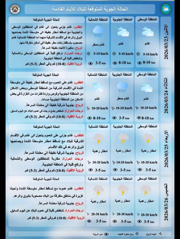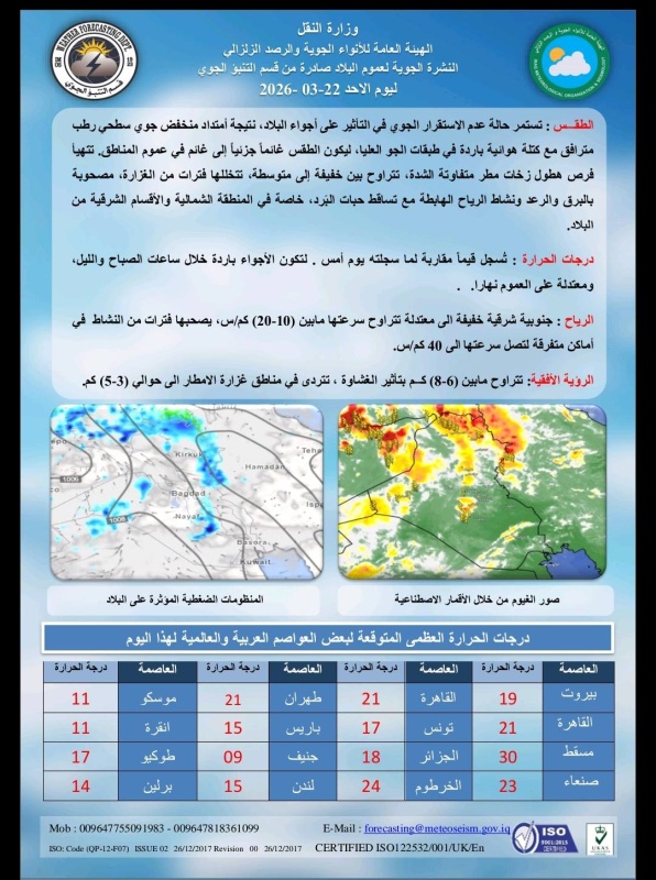 اعلنت هيئة الانواء الجوية، اليوم الاحد ( 22 آذار 2026 )، حالة الطقس المتوقعة في البلاد، فيما اشارت الى فرص لتساقط الامطار وحبات البرد في بعض المناطق الشمالية من البلاد.