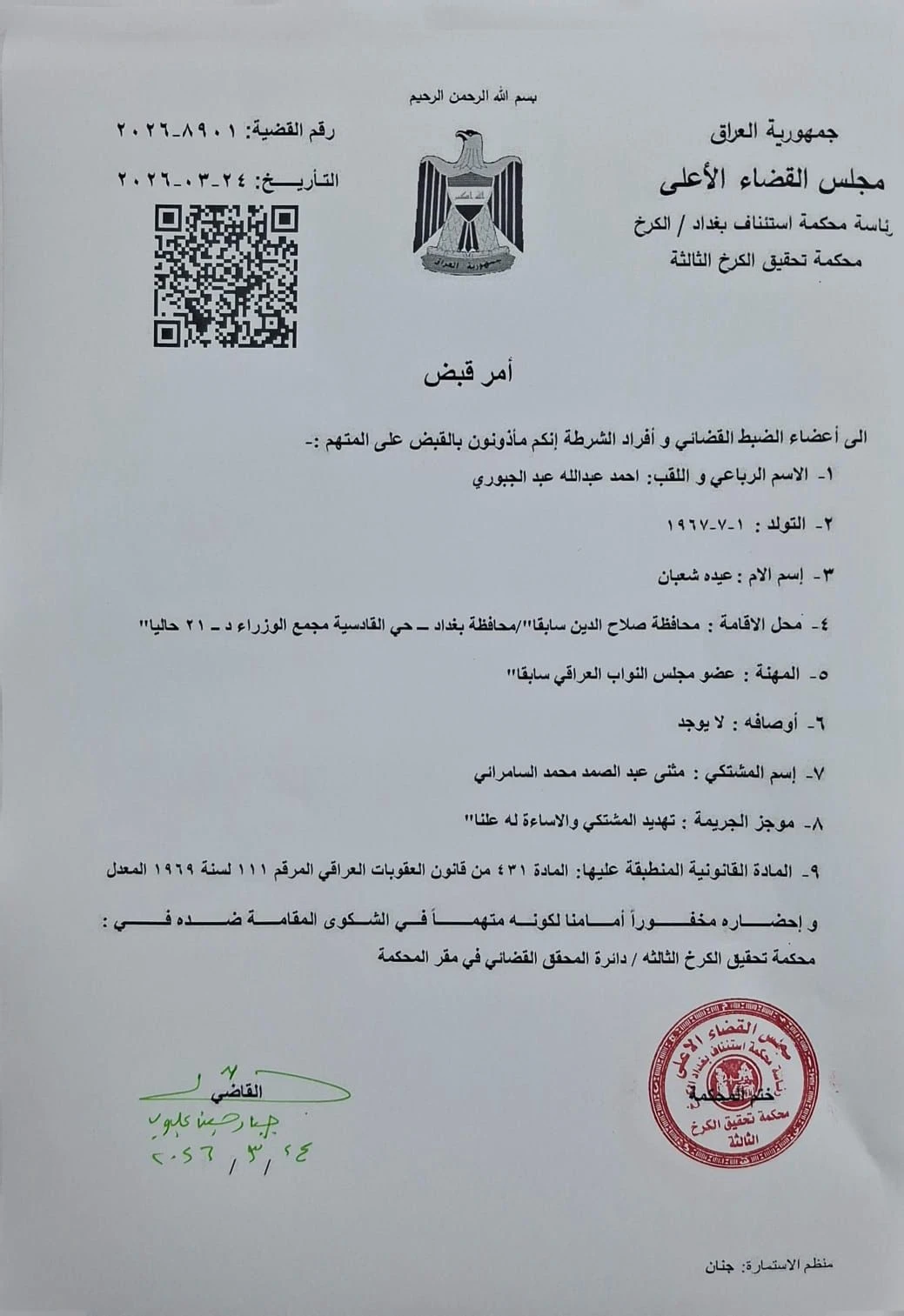 وتضمنت الوثيقة بيانات المتهم، مشيرة إلى أن مهنته “عضو مجلس النواب العراقي سابقاً”، مع توجيه الجهات المختصة بتنفيذ أمر القبض وإحضاره مخفوراً أصولياً كونه متهماً في الشكوى المقامة ضده.