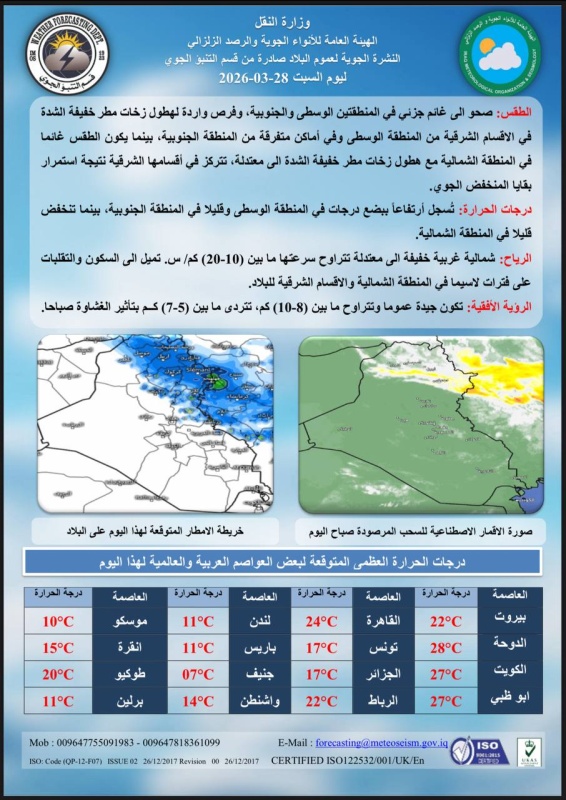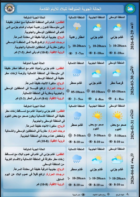 أعلنت هيئة الانواء الجوية، اليوم الاحد ( 29 آذار 2026 )، حالة الطقس المتوقعة في البلاد، فيما اشارت الى فرص لتساقط الامطار الرعدية في المناطق الوسطى والجنوبية وانخفاض بدرجات الحرارة.