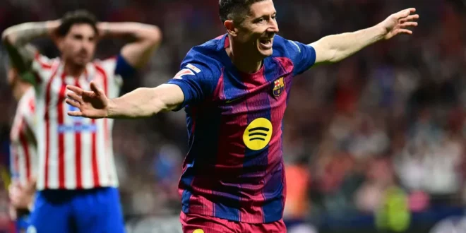سجل البديل روبرت ليفاندوفسكي هدفا في الدقائق الأخيرة ليقود برشلونة للفوز 2-1 على مضيفه أتليتيكو مدريد الذي لعب بعشرة لاعبين السبت، ليوسع الفريق الكتالوني الفارق الذي يفصله عن أقرب منافسيه في صدارة ⁠دوري الدرجة الأولى الإسباني لكرة القدم إلى سبع نقاط.