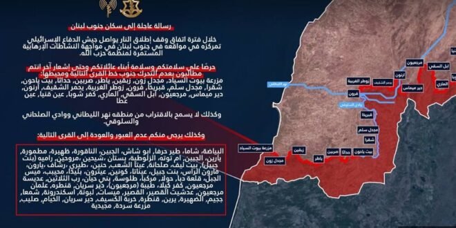 منبر العراق الحر :وجه الجيش الإسرائيلي إنذارا إلى سكان جنوب لبنان، محددا عددا من القرى في جنوب البلاد التي يمنع على الأهالي العودة إليها خلال فترة اتفاق وقف إطلاق النار.