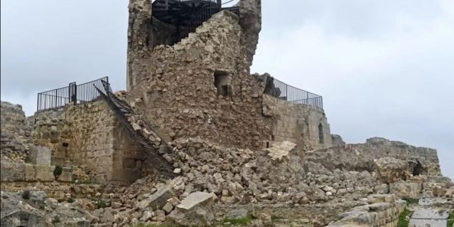 فقد أذاعت المديرية العامة للتراث والمتاحف في سوريا بياناً لمديرها العام همام سعد، ذكر فيه أن قلعة حلب تضررت في الزلزال المدمر، مشيراً إلى “تقارير عن صدع في قلعة حلب، وقد تم إرسال فريق للكشف على الأضرار”. وأشار المسح الأولي إلى أن القلعة تعرضت لأضرار طفيفة ومتوسطة، منها سقوط أجزاء من الطاحونة العثمانية، وحدوث تشقق وتصدع وسقوط أجزاء من الأسوار الدفاعية الشمالية الشرقية. كما سقطت أجزاء كبيرة من قبة منارة الجامع الأيوبي، وتضررت مداخل القلعة وسقطت أجزاء من الحجارة، ومنها مدخل البرج الدفاعي المملوكي، وتعرضت واجهة التكية العثمانية لأضرار.