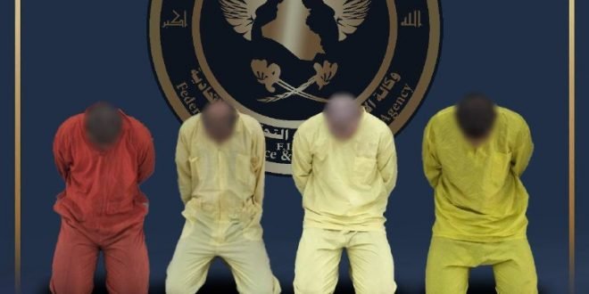 وقال بيان للوكالة: ان “مفارزنا المختصة بمكافحة الإرهاب في نينوى، وبناء على معلومات استخبارية دقيقة، تمكنت من القاء القبض على 4 مطلوبين كانوا ينتمون الى عصابات داعش الإرهابي”، مبيناً انه “من خلال تدقيق البيانات توفرت وثائق تدين المطلوبين بإنتمائهم إلى ما يسمى بـ (فرقة نهاوند وديوان الجند والمعسكرات العامة) ضمن عصابات داعش الإرهابي”.