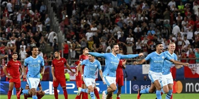 منبر العراق الحر :توج مانشستر سيتي بطلا لكأس السوبر الأوروبي، بعد الفوز بركلات الترجيح 5-4 على إشبيلية، مساء الأربعاء، على ملعب كارايسكاكيس في اليونان.