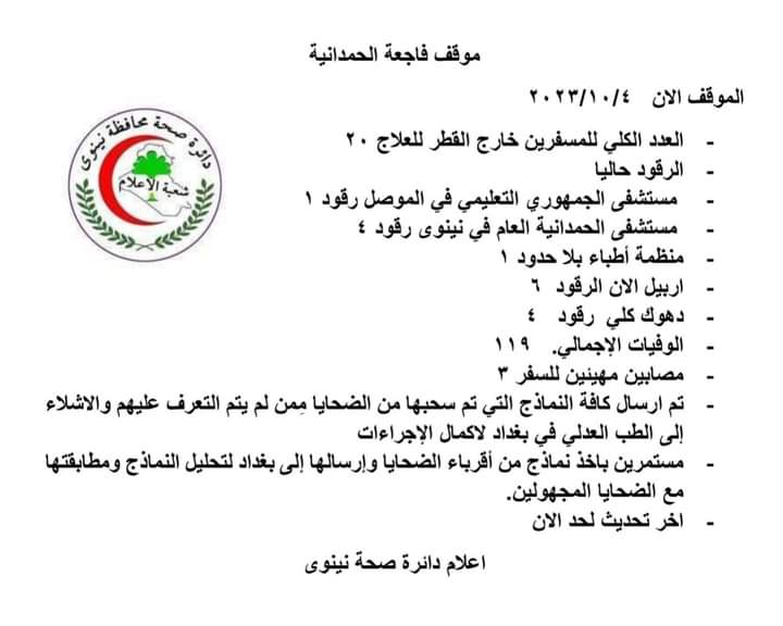 منبر العراق الحر :أعلنت دائرة صحة نينوى، اليوم الأربعاء، الموقف الأخير لضحايا “فاجعة الحمدانية”.