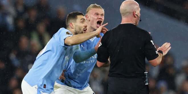 ثارالنجم النرويجي إيرلينغ هالاند، مهاجم مانشستر سيتي الإنجليزي، بوجه الحكم سيمون هوبر الذي أدار مواجهة السيتيزنز أمام توتنهام، والتي انتهت بالتعادل 3-3، الأحد.