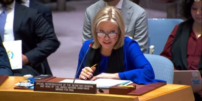 وشددت على أن “الحاجة إلى تقدم مستدام، نحو الإصلاح الحقيقي، وتحسين مستويات المعيشة لن تتراجع. حيث ينمو عدد سكان العراق كل عام. وبينما تحتفظ خطط الحكومة بالمفتاح لتلبية هذه الاحتياجات، فإن تحقيقها سيصبح أصعب مع مرور الأعوام. لقد حان وقت العمل، وأؤكد مرة أخرى على أهمية تهيئة بيئة مواتية والحاجة الماسة إلى إيقاف الهجمات من داخل العراق أو خارجه. وكما ذكرنا في الماضي يجب أن يشمل ذلك كبح جماح الجهات المسلحة التي تعمل خارج سيطرة الدولة. ولا يمكن المبالغة في تقدير المخاطر الهائلة والعواقب المدمرة المحتملة لهذه الأعمال”.