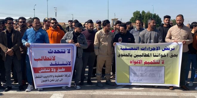 تظاهر العشرات من موظفي شركة الأنابيب التابعة لوزارة النفط في البصرة اليوم الثلاثاء، احتجاجا على “سياسة تكميم الأفواه” حسب وصفهم.