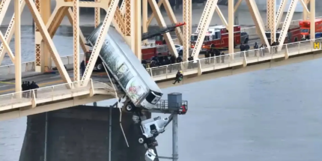 اصطدمت شاحنة بحاجز جسر كلارك على نهر أوهايو في كنتاكي بالولايات المتحدة بعد انحرافها عن مسارها، مما جعلها تتدلى فوق النهر في مشهد مرعب.