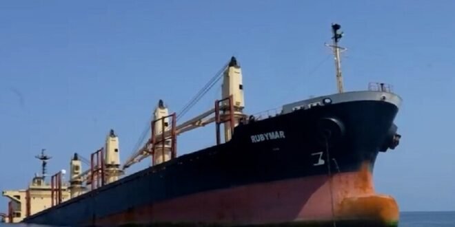 وقالت القيادة في بيان إن ناقلة البضائع “أم ڤي روبيمار” المملوكة للمملكة المتحدة وترفع علم بليز، غرقت يوم 2 مارس حوالي الساعة 2:15 صباحا في البحر الأحمر، جراء تسرب المياه إلى باطنها بعد إصابتها بصاروخ باليستي أطلقه الحوثيون عليها في 18 فبراير الماضي.