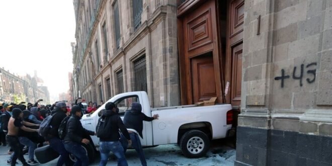 واقتحم عشرات المتظاهرين البوابة باستخدام شاحنة، بينما كان الرئيس أندريس مانويل لوبيز أوبرادور يعقد مؤتمرا صحافيا بالداخل، وفق قناة “ميلينيو تي في”.