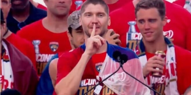 خرج الروسي سيرغي بوبروفسكي حارس مرمى فريق فلوريدا بانثرز حاملا العلم الروسي في موكب احتفالات الفريق ببطولة دوري الهوكي الأمريكي (NHL).
