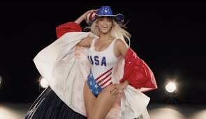 وارادت بيونسيه، المزينة من رأسها إلى أخمص قدميها باللون الأحمر والأبيض والأزرق، معطفًا حريريًا من قماش التفتا من صنع “توم براون” مع زي أبيض مزين بنجوم وخطوط متلألئة عبر الجزء السفلي، مع تدلي شعرها الطويل الأشقر البلاتيني حتى خصرها.