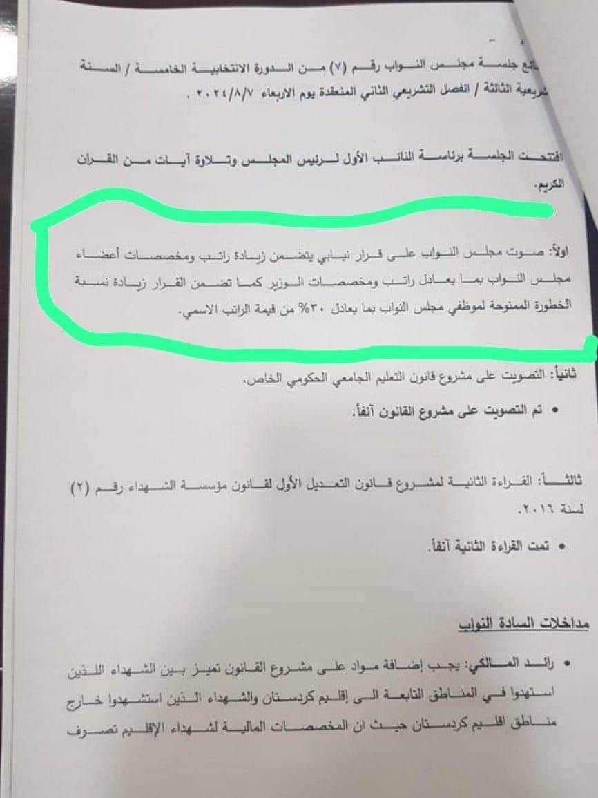 وجاء في الوثيقة ادناه إنه “خلال جلسة مجلس النواب رقم (7) المنعقدة يوم الأربعاء الماضي الموافق 7/8/2024، صوت مجلس النواب على قرار نيابي ينص على زيارة رواتب ومخصصات اعضائه بما يعادل رواتب ومخصصات الوزير، كما تضمن القرار زيادة نسبة الخطورة الممنونة لموظفي المجلس بما يعادل 30% من قيمة الراتب الاسمي”.