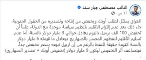 واضاف : “العراق يمتثل لطلب أوبك ويخفض من إنتاجه وتصديره من الحقول الجنوبية، جاء ذلك بعد عدم إلتزام الاقليم بتنظيم سياسة موحدة مع الدولة، علماً أن تخفيض 100 الف برميل باليوم يعادل حوالي 3 مليار دولار بالسنة، أما عدم تسليم الأقليم لنفطهم المصدر بالصهاريج فيعادل ما قيمته 6 مليار دولار بالسنة كقيمة حقيقة للنفط بالرغم من ان اربيل تبيعه بسعر مخفض جداً، فيتضاعف أثر التخفيض ليكون 9 مليار دولار (تخفيض أوبك + تصدير الصهاريج).
