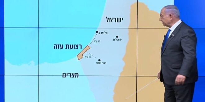 وتحدث خلال مؤتمر صحفي عن أهمية سيطرة الجيش الإسرائيلي على محور فيلادلفيا الحدودي بين قطاع غزة ومصر، لكن خلو الخريطة من أي إشارة إلى الضفة كان لافتا.